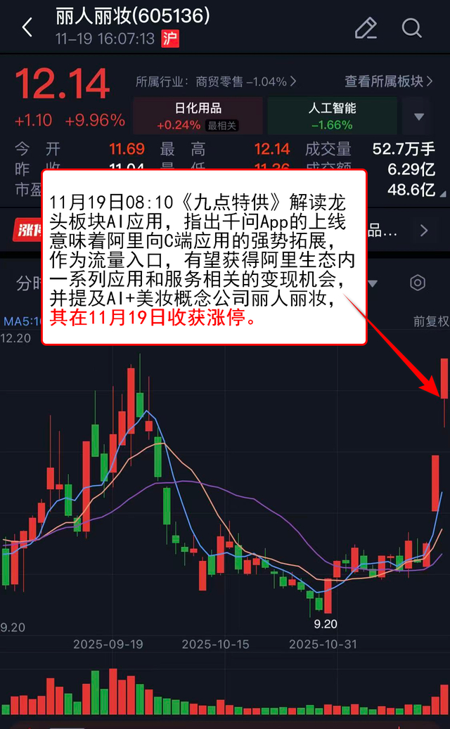 11月19日08:10《九点特供》 解读龙头板块AI应用,指出千问App的上线意味着阿里向C端应用的强势拓展,作为流量入口,有望获得阿里生态内一系列应用和服务相关的变现机会,并提及AI+美妆概念公司丽人丽妆,其在11月19日收获涨停。