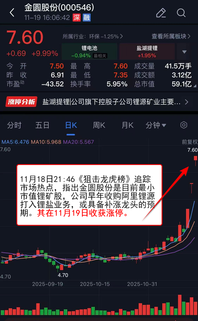 11月18日21:46《狙击龙虎榜》 追踪市场热点,指出金圆股份是目前最小市值锂矿股,公司早年收购阿里锂源打入锂盐业务,或具备补涨龙头的预期。其在11月19日收获涨停。