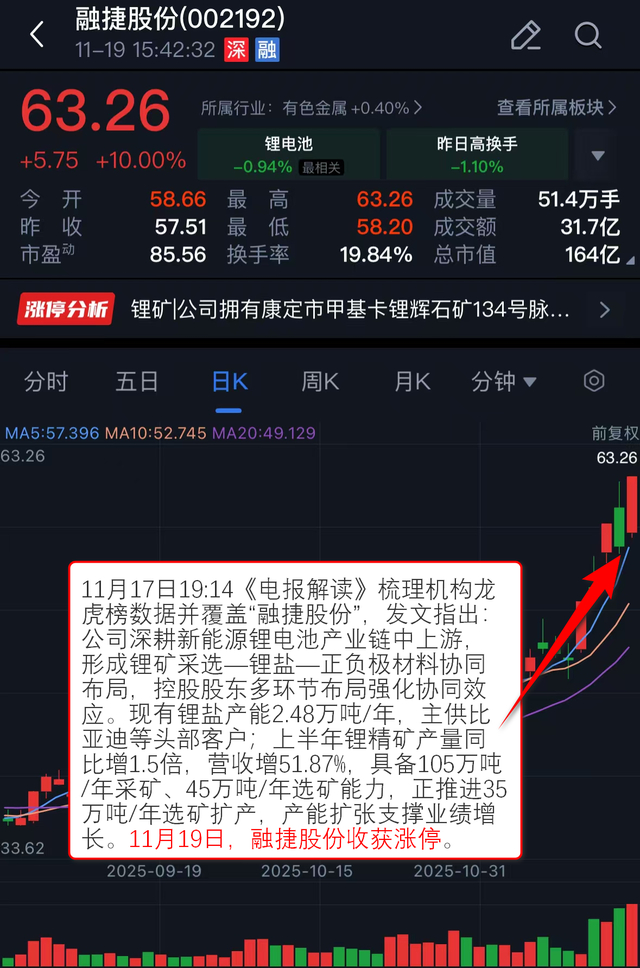 11月17日19:14《电报解读》 梳理机构龙虎榜数据并覆盖“融捷股份”,发文指出:公司深耕新能源锂电池产业链中上游,形成锂矿采选—锂盐—正负极材料协同布局,控股股东多环节布局强化协同效应。现有锂盐产能2.48万吨/年,主供比亚迪等头部客户;上半年锂精矿产量同比增1.5倍,营收增51.87%,具备105万吨/年采矿、45万吨/年选矿能力,正推进35万吨/年选矿扩产,产能扩张支撑业绩增长。11月19日,融捷股份收获涨停。
