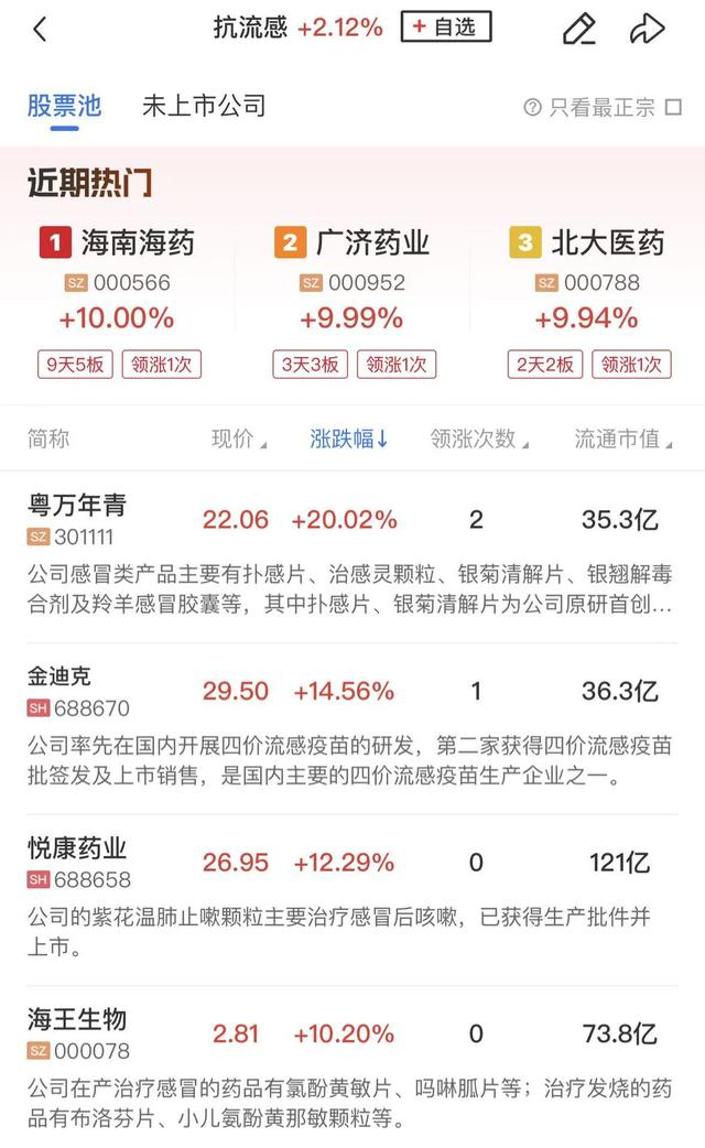 抗流感概念持续活跃,粤万年青、华人健康、海南海药、人民同泰、广济药业、北大医药涨停,金迪克、康芝药业、新华制药等涨幅居前。