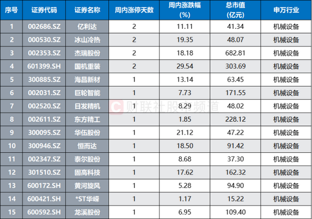 注:本周涨停次数居前的机械设备股(截至12月4日收盘)