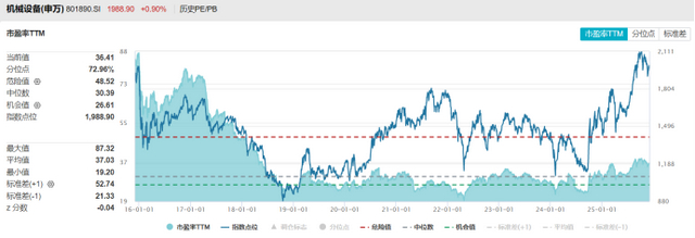从估值层面来看,截至今日数据,机械设备板块指数(申万一级)目前市盈率36.41倍,处于近十年72.96%分位点;市净率2.94倍,处于近十年82.76%分位点。若以整个市场统计,机械设备板块指数目前市盈率分位点在31个申万一级板块中位列第12位,市净率分位点则位列第4位,仅低于通信、电子、汽车板块。
