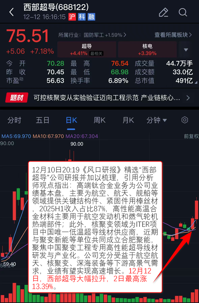 12月10日20:19《风口研报》精选“西部超导”公司研报并加以梳理,引用分析师观点指出:高端钛合金业务为公司业绩基本盘,主要为航空、航天、舰船等领域提供关键结构件、紧固件用棒丝材,2025H1收入占比87%,高性能高温合金材料主要用于航空发动机和燃气轮机热端部件;此外,核聚变领域为ITER项目中国唯一低温超导线材供应商,近期与聚变新能等单位共同成立合肥聚能,聚焦中国聚变工程专用高性能超导线材研发与产业化。公司充分受益于航空航天、核聚变、深海装备等下游高景气需求,业绩有望实现高速增长。12月12日,西部超导大幅拉升,2日最高涨13.39%。