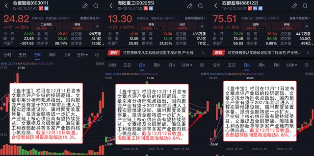 《盘中宝》栏目在12月11日发布文章点评产业链的投研逻辑。文章引用分析师观点指出,国内聚变产业有望于2027年前后进入工程实验堆建设期,届时聚变装置体量、投资金额将进一步扩大,产业链上核心供应商有望持续受益。合锻智能、海陆重工和西部超导等多家产业链内核心供应商,截至12月12日收盘,合锻智能区间最高涨幅达10.3%,海陆重工区间最高涨幅达8.84%,西部超导区间最高涨幅达8.86%。
