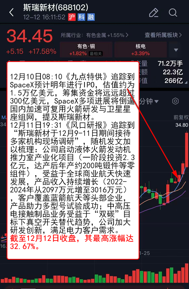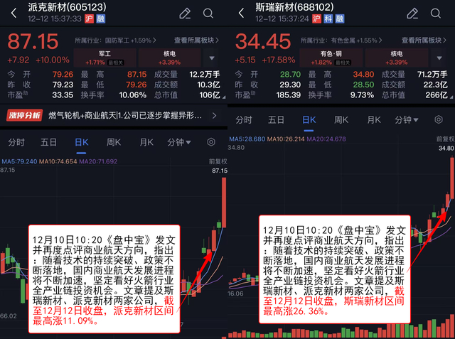 12月10日10:20《盘中宝》 发文并再度点评商业航天方向,指出:随着技术的持续突破、政策不断落地,国内商业航天发展进程将不断加速,坚定看好火箭行业全产业链投资机会。文章提及斯瑞新材、派克新材两家公司,截至12月12日收盘,斯瑞新材区间最高涨26.36%,派克新材区间最高涨11.09%。
