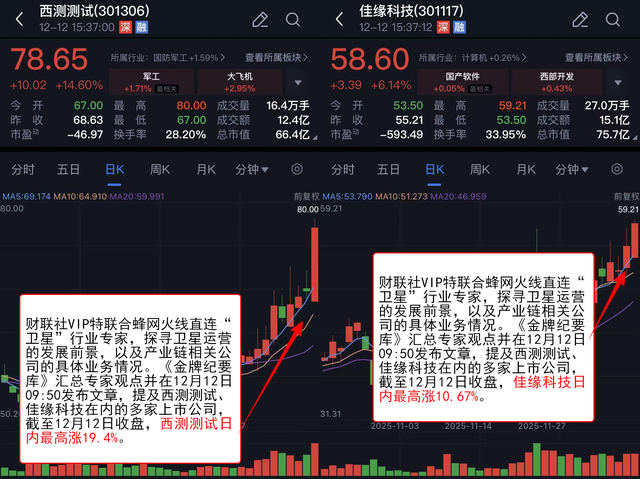财联社VIP特联合蜂网火线直连“卫星”行业专家,探寻卫星运营的发展前景,以及产业链相关公司的具体业务情况。《金牌纪要库》汇总专家观点并在12月12日09:50发布文章,提及西测测试、佳缘科技在内的多家上市公司,截至12月12日收盘,西测测试日内最高涨19.4%,佳缘科技日内最高涨10.67%。