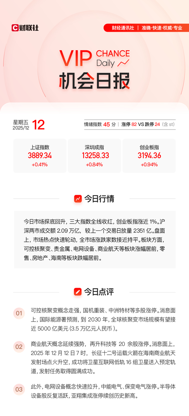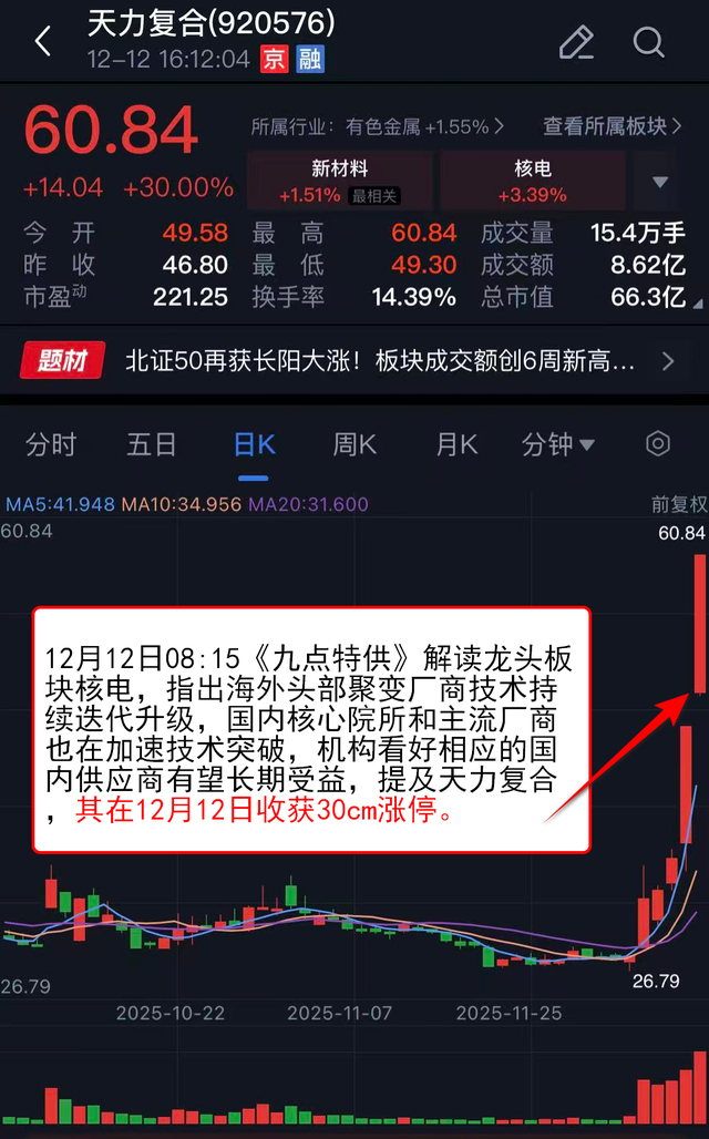 12月12日08:15《九点特供》解读龙头板块核电,指出海外头部聚变厂商技术持续迭代升级,国内核心院所和主流厂商也在加速技术突破,机构看好相应的国内供应商有望长期受益,提及天力复合,其在12月12日收获30cm涨停。