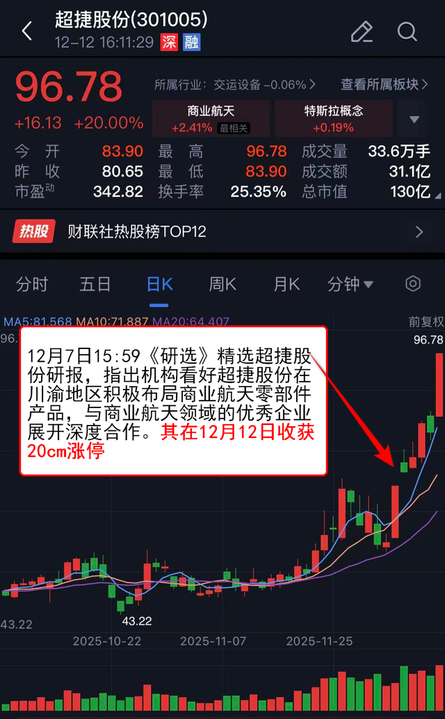 12月7日15:59《研选》 精选超捷股份研报,指出机构看好超捷股份在川渝地区积极布局商业航天零部件产品,与商业航天领域的优秀企业展开深度合作。其在12月12日收获20cm涨停。