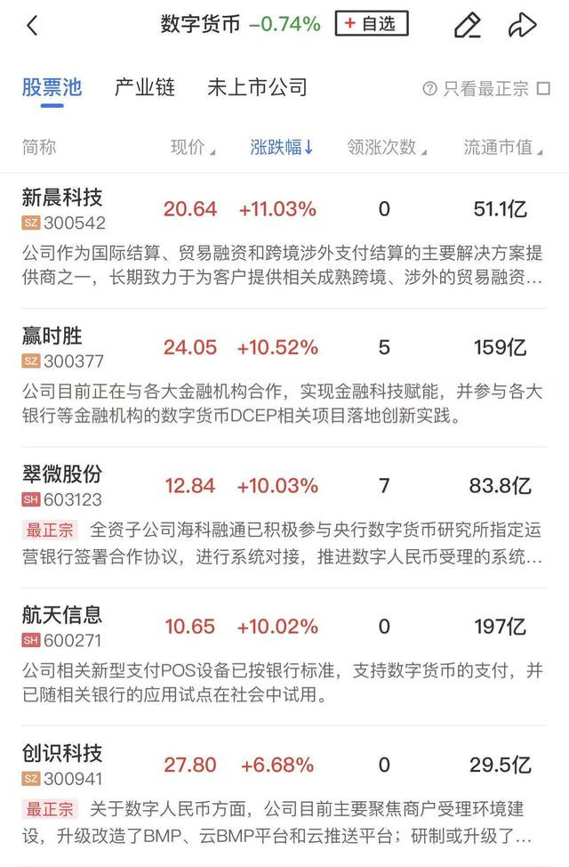 数字货币概念股同样走强,翠微股份、航天信息涨停,新晨科技、赢时胜等涨超10%,创识科技、御银股份、雄帝股份等涨幅居前。
