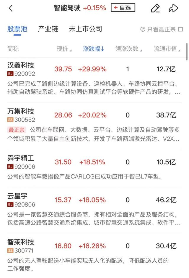 智能驾驶概念表现活跃,浙江世宝、索菱股份、万集科技、汉鑫科技、北汽蓝谷、路畅科技、锦江在线等个股涨停。