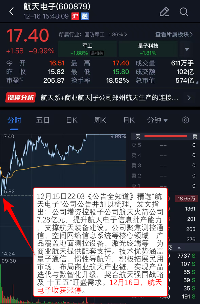 12月15日22:03《公告全知道》 精选“航天电子”公司公告并加以梳理,发文指出:公司增资控股子公司航天火箭公司7.28亿元,提升航天电子信息批产能力,支撑航天装备建设。公司聚焦测控通信、空间网络信息系统等核心领域,产品覆盖地面测控设备、激光终端等,为商业航天提供配套支持。技术优势涵盖量子通信、惯性导航等,积极拓展民用市场,布局商业航天产业链,实现产品迭代与数智化升级,契合航天强国战略及“十五五”旺盛需求。12月16日,航天电子收获涨停。
