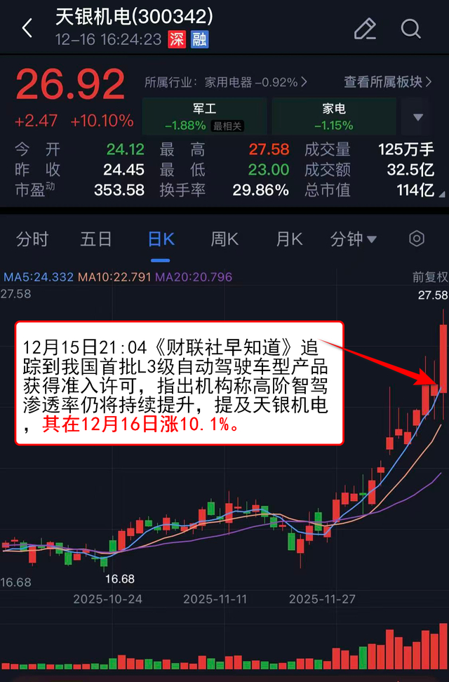 12月15日21:04《财联社早知道》 追踪到我国首批L3级自动驾驶车型产品获得准入许可,指出机构称高阶智驾渗透率仍将持续提升,提及天银机电,其在12月16日涨10.1%。