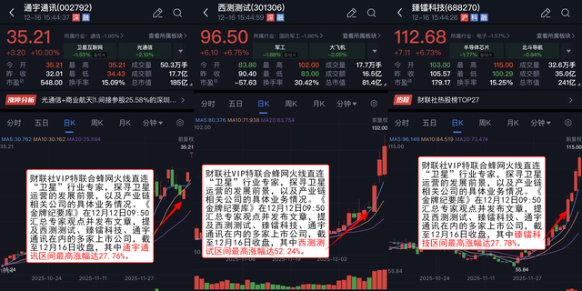 财联社VIP特联合蜂网火线直连“卫星”行业专家,探寻卫星运营的发展前景,以及产业链相关公司的具体业务情况。《金牌纪要库》在12月12日09:50汇总专家观点并发布文章,提及西测测试、臻镭科技、通宇通讯在内的多家上市公司,截至12月16日收盘,其中西测测试区间最高涨幅达52.24%,臻镭科技区间最高涨幅达27.78%,通宇通讯区间最高涨幅达27.76%。