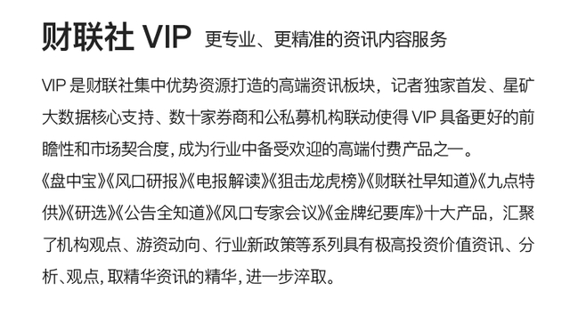 注:财联社VIP为内容资讯产品,并非投资建议。以下内容仅为资讯价值展示非对相关公司的推荐建议,非未来走势预测。投资有风险,入市需谨慎。