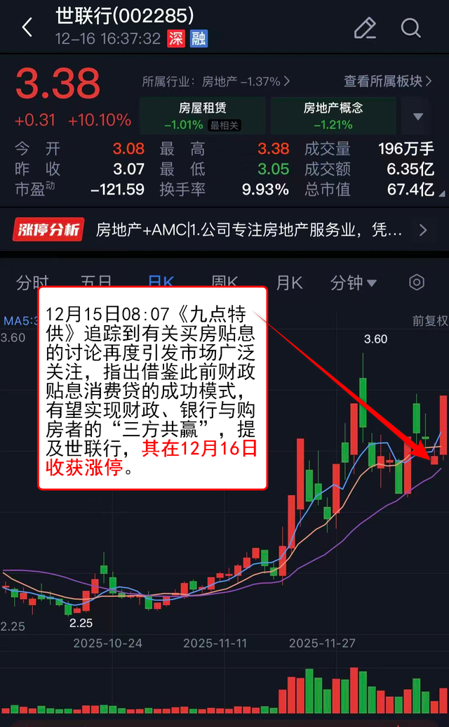 12月15日08:07《九点特供》 追踪到有关买房贴息的讨论再度引发市场广泛关注,指出借鉴此前财政贴息消费贷的成功模式,有望实现财政、银行与购房者的“三方共赢”,提及世联行,其在12月16日收获涨停。