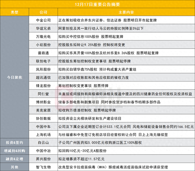 中金公司(601995.SH)公告称,公司与东兴证券、信达证券正在筹划由中金公司通过换股方式吸收合并东兴证券、信达证券。公司A股股票自2025年11月20日起停牌,于2025年12月18日开市起复牌。本次交易方案尚需公司另行召开董事会再次审议及股东会审议批准,并取得相应批准、核准、注册或同意后方可实施。
