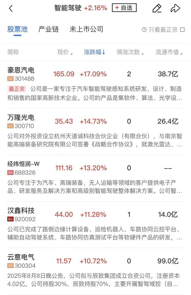智能驾驶概念走强,浙江世宝4连板,路畅科技4天2板,威帝股份、索菱股份、山子高科等涨停,豪恩汽电、经纬恒润、汉鑫科技等涨超10%。