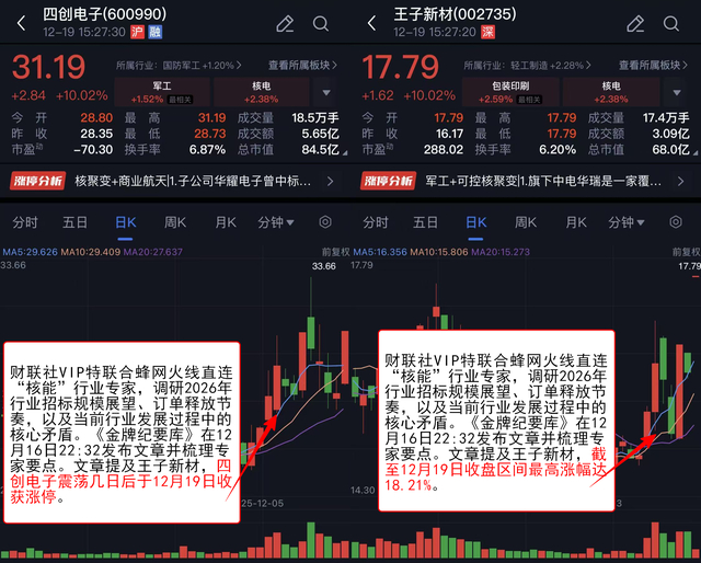 财联社VIP特联合蜂网火线直连“核能”行业专家,调研2026年行业招标规模展望、订单释放节奏,以及当前行业发展过程中的核心矛盾。《金牌纪要库》在12月16日22:32发布文章并梳理专家要点。文章提及王子新材,截至12月19日收盘区间最高涨幅达18.21%。四创电子震荡几日后于12月19日收获涨停。