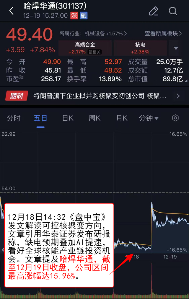 12月18日14:32《盘中宝》 发文解读可控核聚变方向,文章引用华泰证券发布研报称,缺电预期叠加AI提速,看好全球核能产业链投资机会。文章提及哈焊华通,截至12月19日收盘,公司区间最高涨幅达15.96%。.