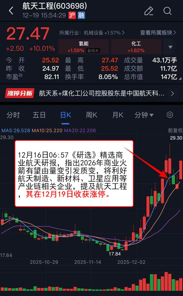 12月16日06:57《研选》 精选商业航天研报,指出2026年商业火箭有望由量变引发质变,将利好航天制造、新材料、卫星应用等产业链相关企业,提及航天工程,其在12月19日收获涨停。