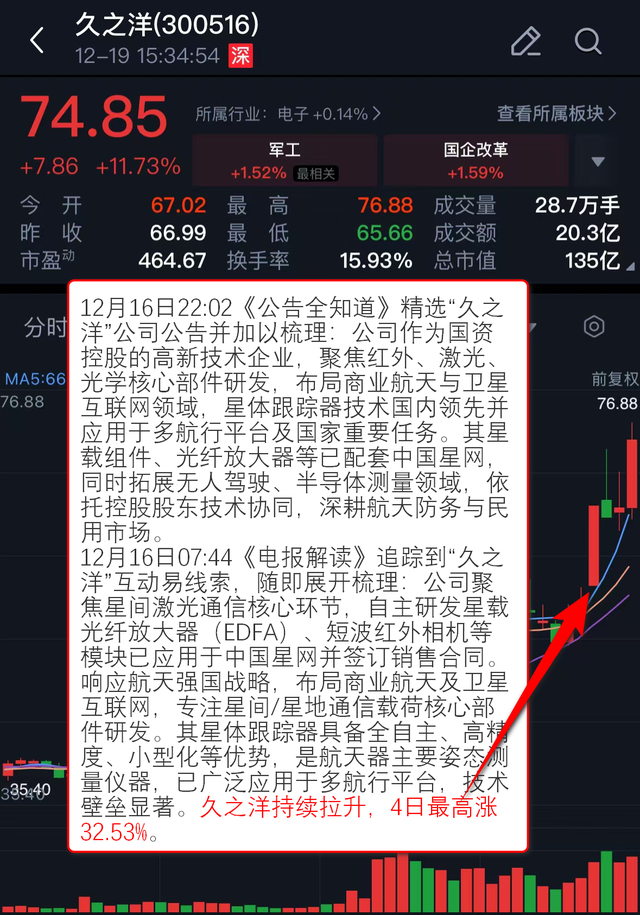 12月16日07:44《电报解读》 追踪到“久之洋”互动易线索,随即展开梳理:公司聚焦星间激光通信核心环节,自主研发星载光纤放大器(EDFA)、短波红外相机等模块已应用于中国星网并签订销售合同。响应航天强国战略,布局商业航天及卫星互联网,专注星间/星地通信载荷核心部件研发。其星体跟踪器具备全自主、高精度、小型化等优势,是航天器主要姿态测量仪器,已广泛应用于多航行平台,技术壁垒显著。