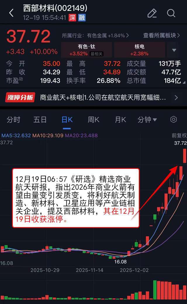 12月19日06:57《研选》 精选商业航天研报,指出2026年商业火箭有望由量变引发质变,将利好航天制造、新材料、卫星应用等产业链相关企业,提及西部材料,其在12月19日收获涨停。