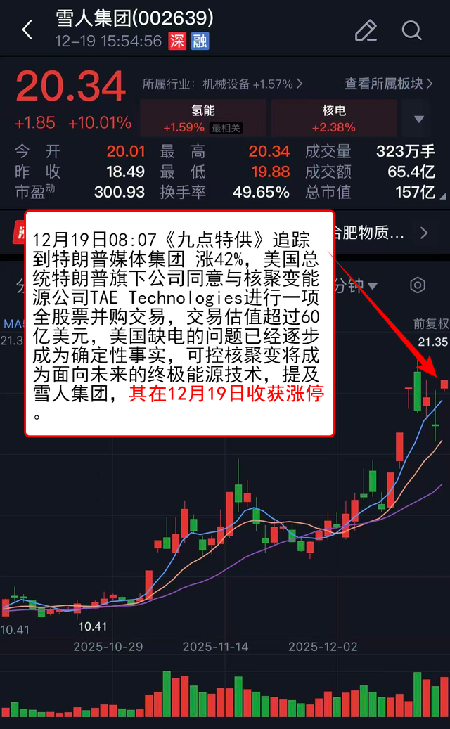 12月19日08:07《九点特供》 追踪到特朗普媒体集团 涨42%,美国总统特朗普旗下公司同意与核聚变能源公司TAE Technologies进行一项全股票并购交易,交易估值超过60亿美元,美国缺电的问题已经逐步成为确定性事实,可控核聚变将成为面向未来的终极能源技术,提及雪人集团,其在12月19日收获涨停。