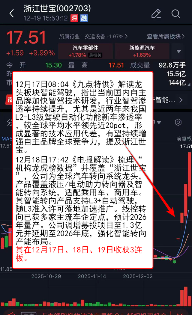 其在12月17日、18日、19日收获3连板。