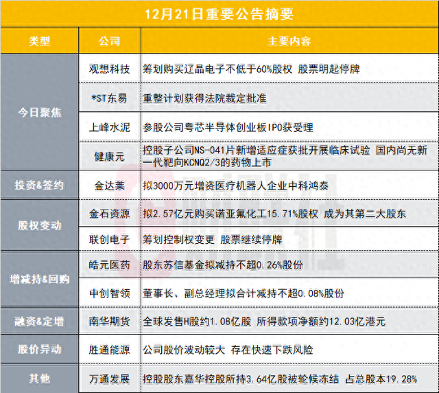 观想科技(301213.SZ)公告称,公司正在筹划发行股份购买锦州辽晶电子科技股份有限公司公司(简称“辽晶电子”)不低于60%的股权并募集配套资金事项,辽晶电子经营范围包括集成电路、电力、电子元器件的设计、生产、销售等。因有关事项尚存不确定性,为了维护投资者利益,避免对公司证券交易造成重大影响,公司股票自2025年12月22日起开始停牌。预计在不超过10个交易日的时间内披露本次交易方案。若公司未能在上述期限内召开董事会审议并披露交易方案,公司证券最晚将于2026年1月7日开市起复牌并终止筹划相关事项。