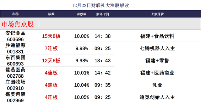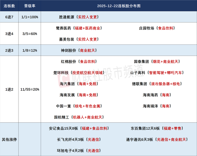 财联社12月22日讯,今日80股涨停,32股炸板,封板率为71%,胜通能源7连板,鹭燕医药、庄园牧场4连板,嘉美包装7天5板,神剑股份3连板,安记食品15天8板,东百集团12天6板,北交所田野股份30cm首板。市场高开高走,三大指数集体反弹,创业板指涨超2%。沪深两市成交额1.86万亿,较上一个交易日放量1360亿。盘面上,市场热点快速轮动,全市场超2900只个股上涨。板块方面,海南自贸区、贵金属、算力硬件等板块涨幅居前,医药商业、影视院线、教育、银行等板块跌幅居前。截至收盘,沪指涨0.69%,深成指涨1.47%,创业板指涨2.23%。
