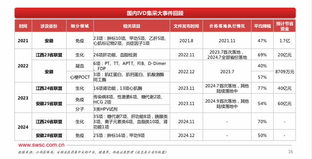统计显示,截至2024年,IVD已完成5轮省联盟集采,包括江西牵头的3轮生化试剂集采以及安徽牵头的2轮免疫试剂集采,集采范围基本已覆盖核心品种和省市。