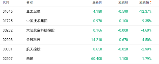 截至收盘,亚太卫星(01045.HK)跌12.37%、中国技术集团(01725.HK)跌9.35%、金风科技(02208.HK)跌4.50%。