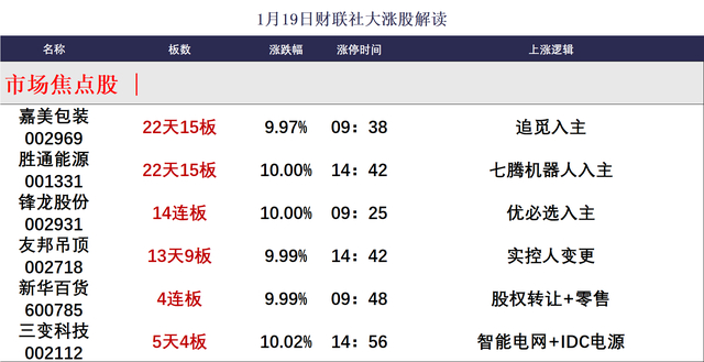 财联社1月19日讯,今日88股涨停,20股炸板,封板率为60%,锋龙股份14连板,新华百货4连板,嘉美包装、胜通能源22天15板,友邦吊顶13天9板,三变科技5天4板。三大指数涨跌不一,沪指走势较强,创业板指冲高回落。沪深两市成交额2.71万亿,较上一个交易日缩量3179亿。盘面上,全市场超3500只个股上涨。板块方面,电网设备、军工、机器人、贵金属板块领涨,算力硬件、AI应用、消费电子板块领跌。截至收盘,沪指涨0.29%,深成指涨0.09%,创业板指跌0.7%。