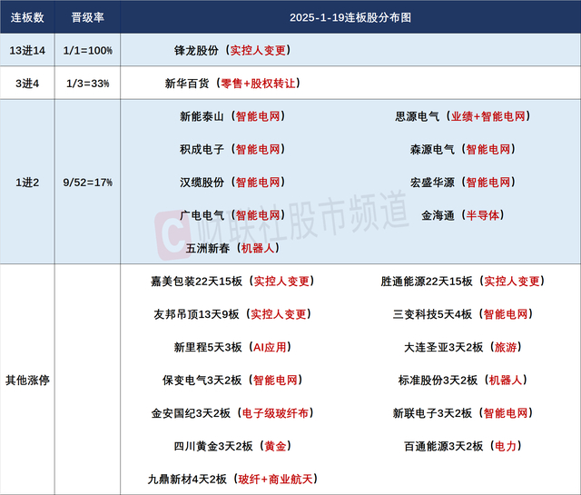 连板晋级率33.33%,3板以上连板股降至2只,随着锋龙股份复牌后继续封死一字涨停,高位股展开局部修复,嘉美包装、胜通能源两只叠加并购重组概念的前期人气股双双封板。不过叠加前期领涨主线商业航天和AI应用两大方向的前期热门股亏钱效应不减,海格通信、神剑股份、东方通信等多股遭遇3连跌停。此前深幅调整的弹性方向随着做空动能释放完毕展开局部修复,上周冲高回落的北证电网股亿能电力实现30厘米反包板,上周复牌跌停的20厘米人气股志特新材盘中一度涨逾10%。不过随着短线卖压快速释放,部分前期高位股若能陆续展开止跌修复,则仍有利于短线市场情绪的平复。
