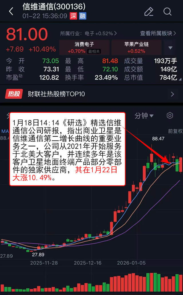 1月18日14:14《研选》 精选信维通信公司研报,指出商业卫星是信维通信第二增长曲线的重要业务之一,公司从2021年开始服务于北美大客户,并连续多年是该客户卫星地面终端产品部分零部件的独家供应商,其在1月22日大涨10.49%。