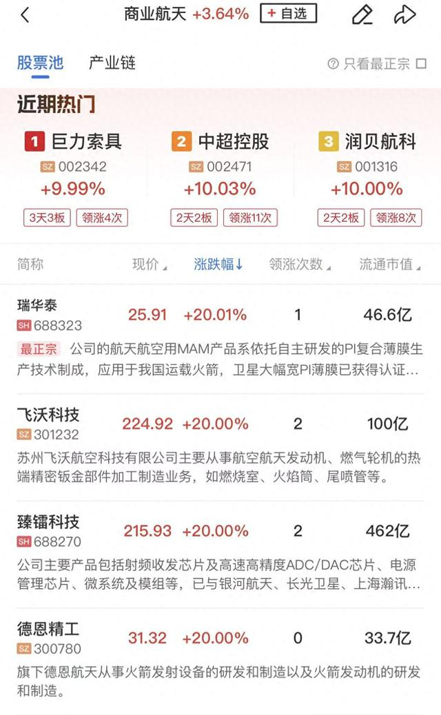 板块上,商业航天概念股全线爆发,飞沃科技、臻雷科技、德恩精工、烽火电子、中超控股、金风科技、西部材料等20余股涨停。
