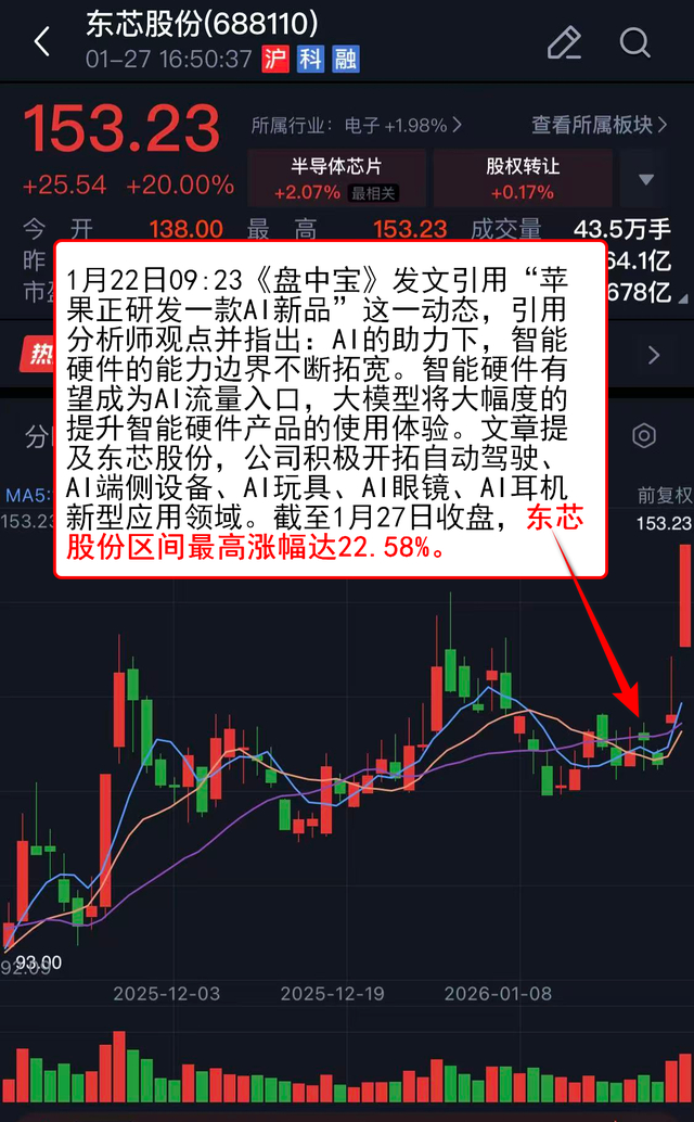 1月22日09:23《盘中宝》 发文引用“苹果正研发一款AI新品”这一动态,引用分析师观点并指出:AI的助力下,智能硬件的能力边界不断拓宽。智能硬件有望成为AI流量入口,大模型将大幅度的提升智能硬件产品的使用体验。文章提及东芯股份,公司积极开拓自动驾驶、AI端侧设备、AI玩具、AI眼镜、AI耳机新型应用领域。截至1月27日收盘,东芯股份区间最高涨幅达22.58%。