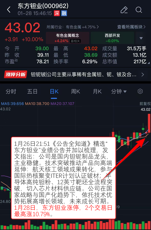 1月26日21:51《公告全知道》 精选“东方钽业”业绩公告并加以梳理,发文指出:公司是国内钽铌制品龙头,主业稳健。技术突破推动产品向高端延伸:航天核工领域成果转化,参与国际热核聚变ITER计划认证铍材;半导体高纯钽粉、12英寸靶坯全流程突破,切入芯片材料供应链。公司在国家战略与国产化趋势下,依托技术优势拓展高增长领域,未来成长可期。1月28日,东方钽业涨停,2个交易日最高涨10.79%。