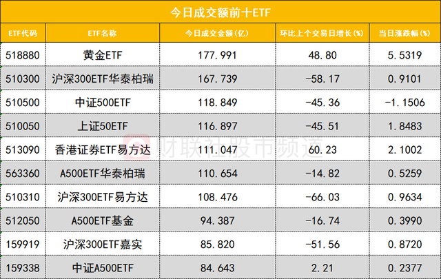 从成交额前十的ETF来看,黄金ETF(518880)成交额位居首位,沪深300ETF华泰柏瑞(510300)成交额位居次席。