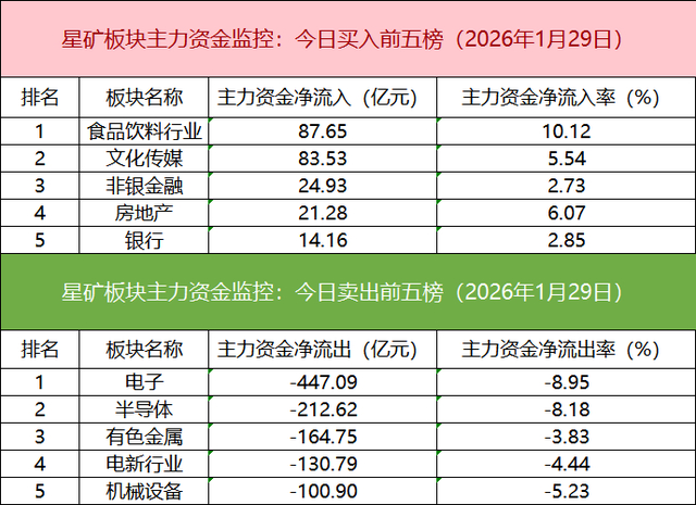 从主力板块资金监控数据来看,食品饮料行业主力资金净流入居首。