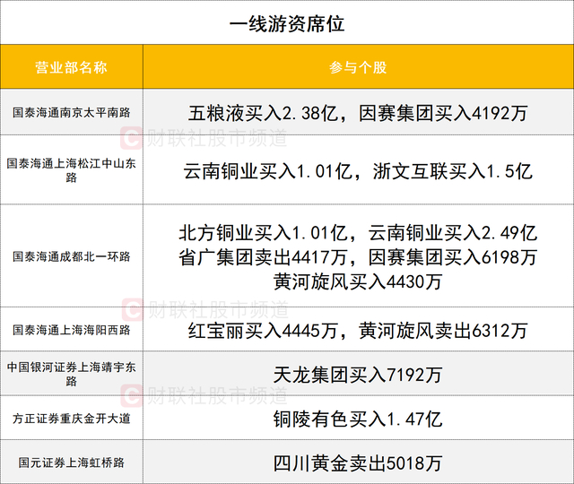 一线游资活跃度一般,有色金属板块依旧强者恒强,铜陵有色走出5天4板,获一家一线游资(方正证券重庆金开大道)买入1.47亿,同时深股通买入2.41亿。五粮液获一家一线游资(国泰海通南京太平南路)买入2.38亿。