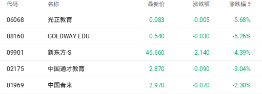 截至收盘,新东方-S(09901.HK)跌4.39%、中国东方教育(00667.HK)跌2.25%、中国新华教育(02779.HK)跌1.79%。