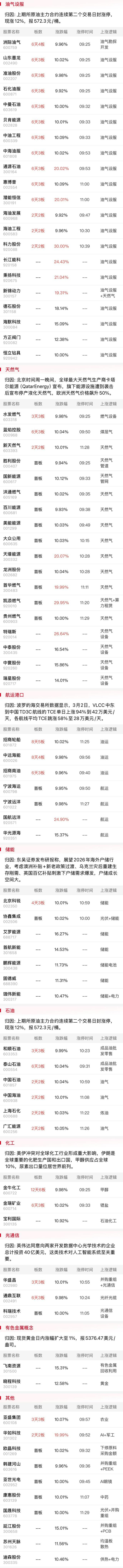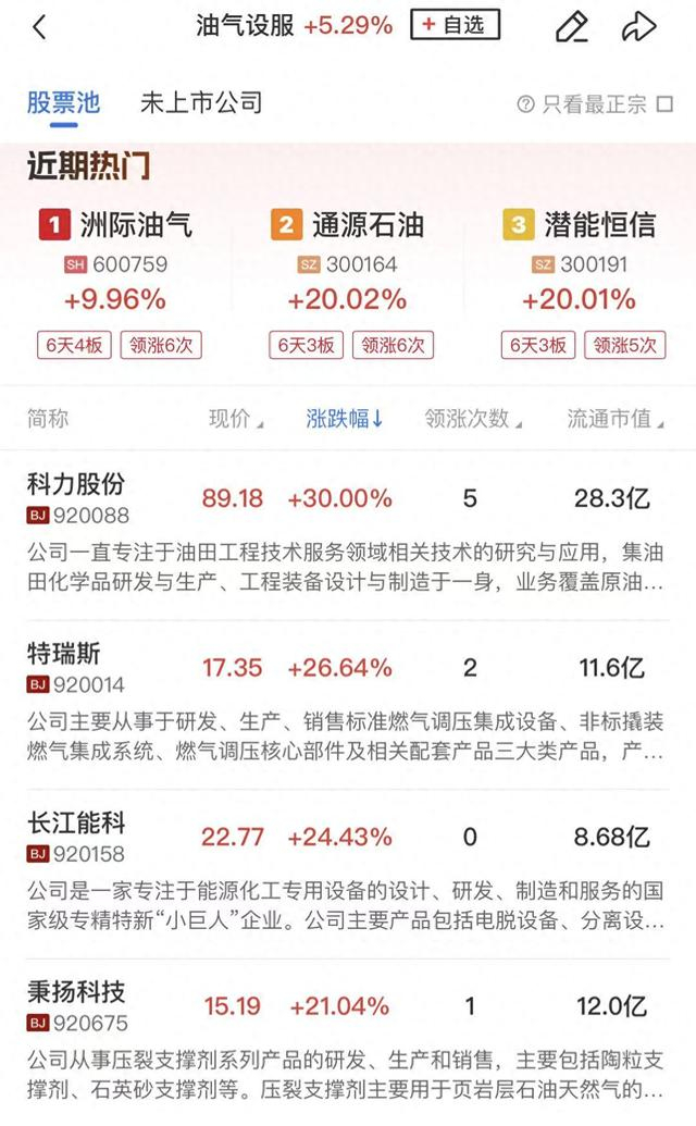 板块上,油气板块再度爆发,中国石化、中国石油、中国海油再度全线涨停,科力股份、通源石油、潜能恒信、中油工程、惠博普、中海油服等涨停。