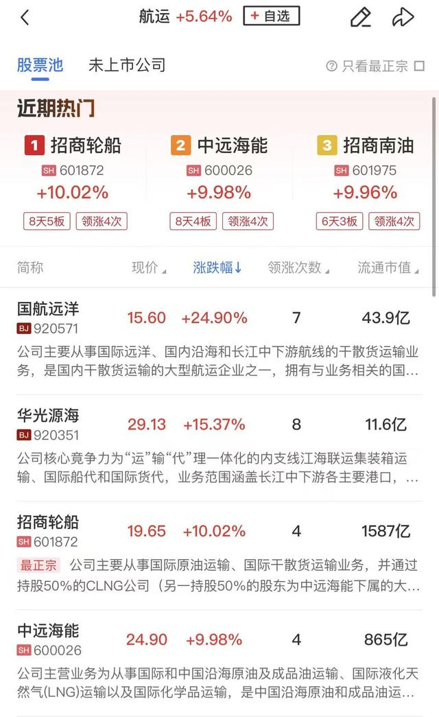 港口航运概念延续强势,中远海能2连板,招商南油、宁波海运、招商轮船涨停,南京港、锦江航运、中远海发、中远海控涨幅居前。