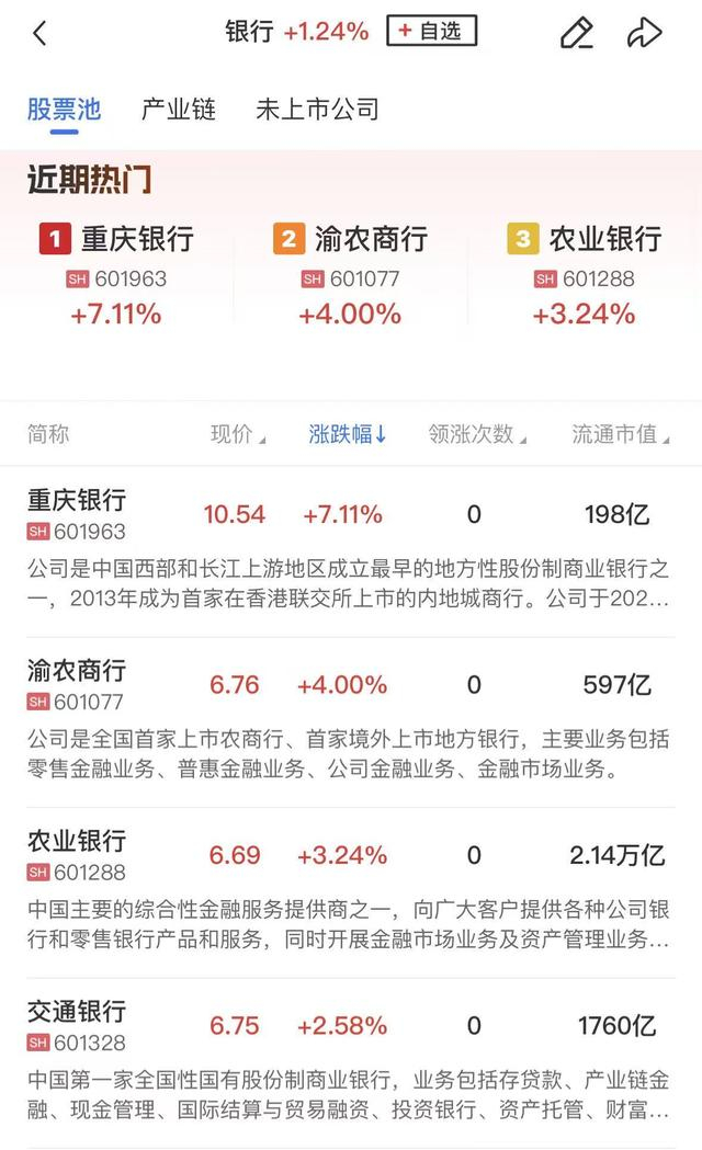 银行板块集体反弹,重庆银行涨超7%,渝农商行、农业银行、交通银行、工商银行、建设银行等个股涨幅居前。