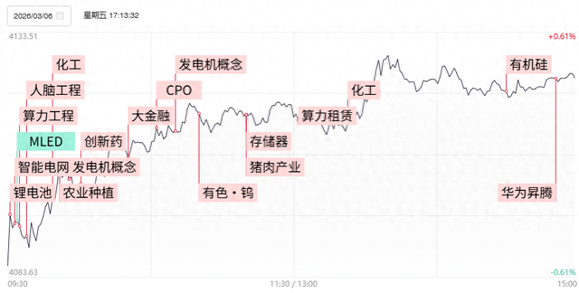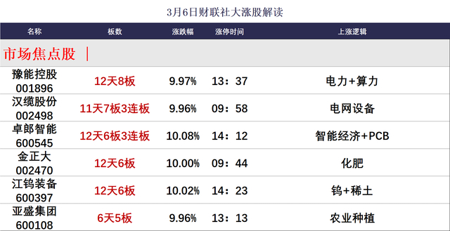 财联社3月6日讯,今日74股涨停,26股炸板,封板率为74%,王力安防、卓郎智能、顺钠股份、汉缆股份3连板,豫能控股12天8板,金正大、江钨装备12天6板,亚盛集团6天5板,泰嘉股份10天5板。沪指、深成指低开高走,创业板指冲高回落,此前一度涨近1%,黄白线明显分化,微盘股指数涨超3%。沪深两市成交额2.2万亿,较上一个交易日缩量1899亿。盘面上,市场热点快速轮动,全市场超4200只个股上涨。板块方面,猪肉、化工、创新药、电网设备板块领涨;油气、玻纤、有色、MicroLED概念领跌。