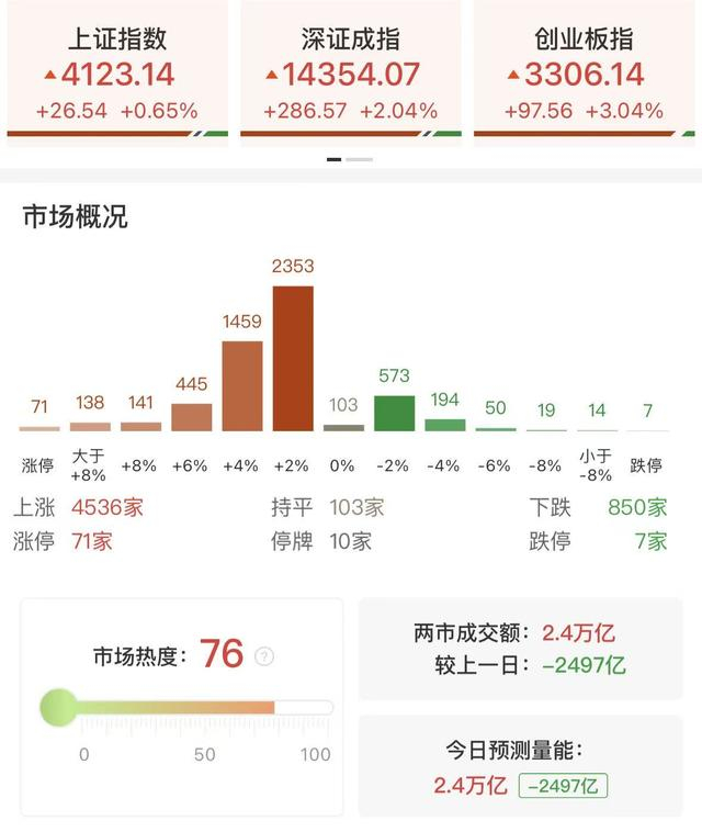 财联社3月10日讯,三大指数集体反弹,深成指涨超2%,创业板指涨超3%。沪深两市成交额2.4万亿,较上一个交易日缩量2497亿。盘面上,市场热点快速轮动,全市场超4500只个股上涨。从板块来看,算力硬件概念持续拉升,长光华芯20cm涨停,创历史新高,中英科技、迅捷兴、东山精密、汇绿生态、广合科技、长飞光纤涨停。电力板块表现活跃,绿发电力、华电能源、晶科科技涨停。商业航天概念走强,航天电器、中衡设计涨停。下跌方面,油气股集体下挫,准油股份、洲际油气跌停。煤炭板块走弱,中煤能源大跌。截至收盘,沪指涨0.65%,深成指涨2.04%,创业板指涨3.04%。