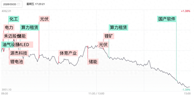 财联社3月20日讯,今日28股涨停,23股炸板,封板率为55%,深华发A、华电辽能5连板,大胜达、韶能股份3连板,华电能源9天6板,正泰电源、国晟科技8天4板。市场全天冲高回落,沪指震荡调整失守半年线,跌破4000点整数关口,创业板指盘中刷新年内新高后快速回落。黄白二线分化明显,中小盘股普跌,微盘股指数跌超3%。沪深两市成交额2.29万亿,较上一个交易日放量1759亿。盘面上,全市场连续两日超4700只个股下跌。板块方面,光伏、储能、电力、锂电池方向领涨;算力租赁、油气、化工板块领跌。截至收盘,沪指跌1.24%,深成指跌0.25%,创业板指涨1.3%。