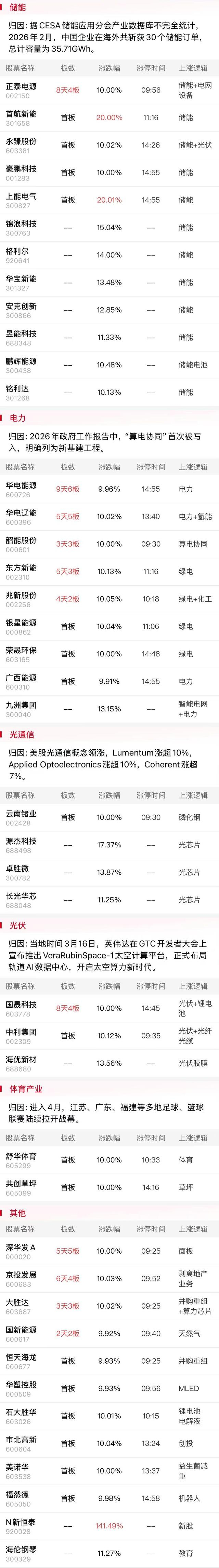 随着中东局势冲突加剧,天然气等能源生产设施成为各方的攻击目标,昨日ICE英国天然气期货较2026年低点上涨121.5%,TTF荷兰天然气期货上涨120.8%。上游气价上涨向电价传导预期强化,储能产业链持续站上风口,逆变器方向涨势火爆,上能电气、首航新能封涨停,锦浪科技、昱能科技、德业股份等涨幅靠前。此外受益储能电池需求排产双旺,电池产业链也迎来强力补涨,石大胜华、璞泰来、赣锋锂业触及涨停,华宝新能、鹏辉能源双双涨超10%。除去海外对于能源安全焦虑,对分布式储能项目强劲的装机需求外,国内AIDC对于供电稳定性的极致要求,使得储能配套有望升级为刚需。不过当前储能为首的新能源赛道仍高度绑定中东局势的情绪面驱动,且短线资金向新能源赛道的过度集中,短线波动风险仍不容忽视。