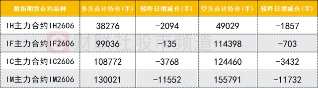 四大期指主力合约中,IH、IF、IC、IM合约多空双方均减仓,IF合约空头减仓数量较多。